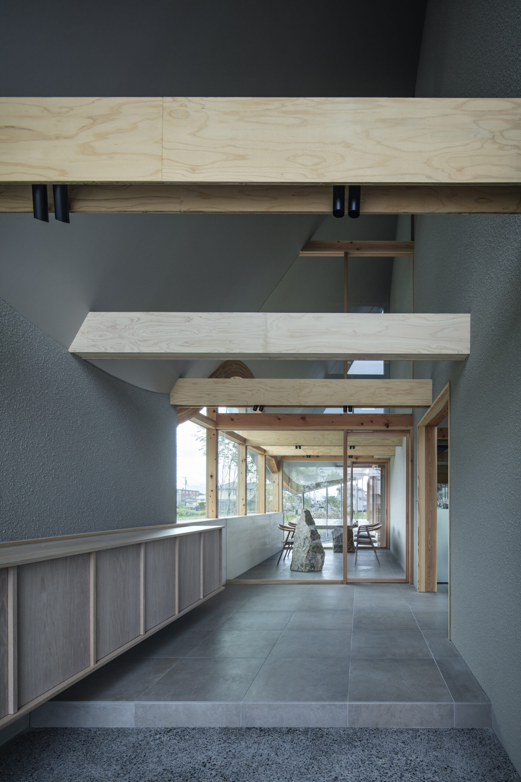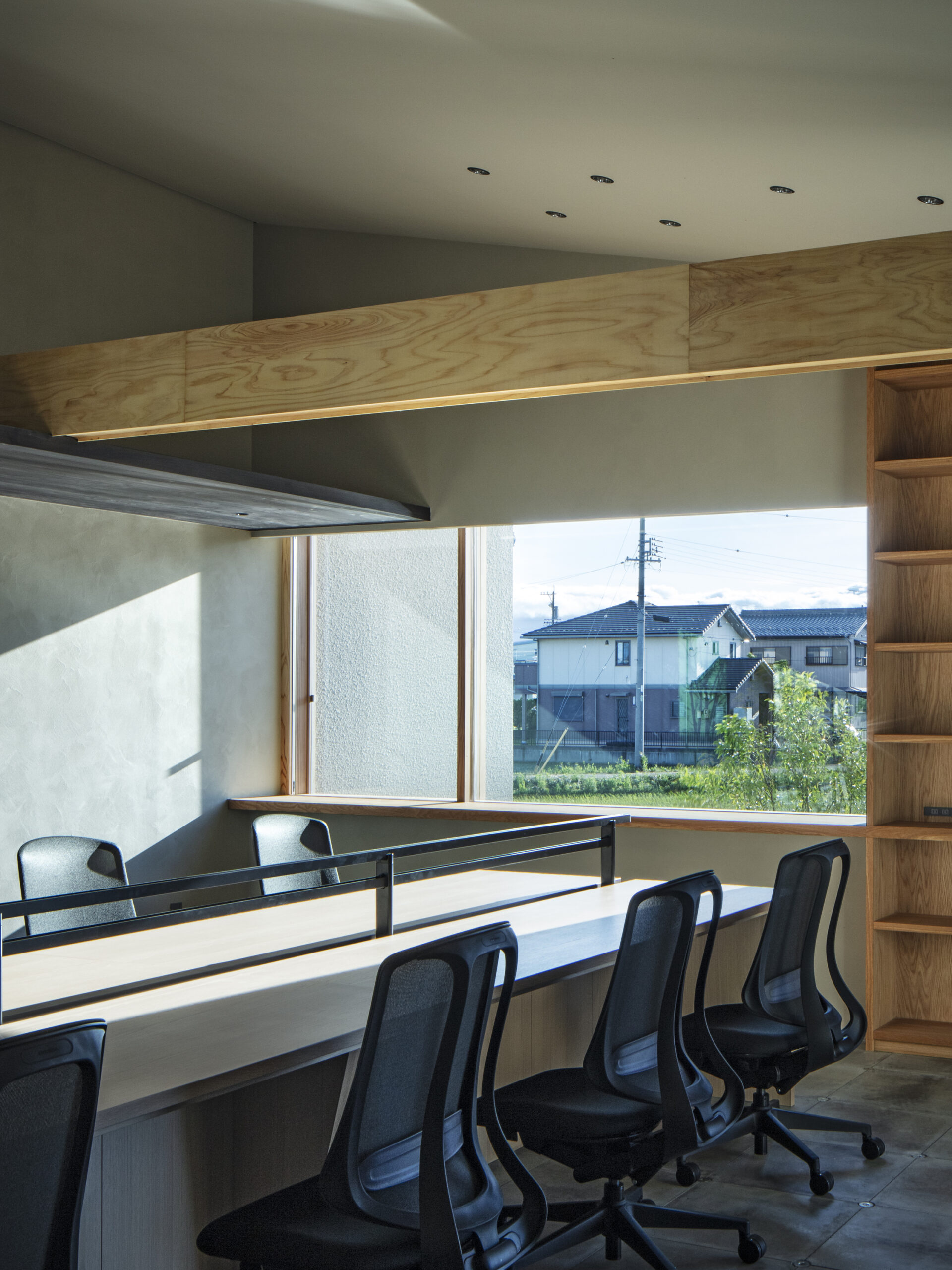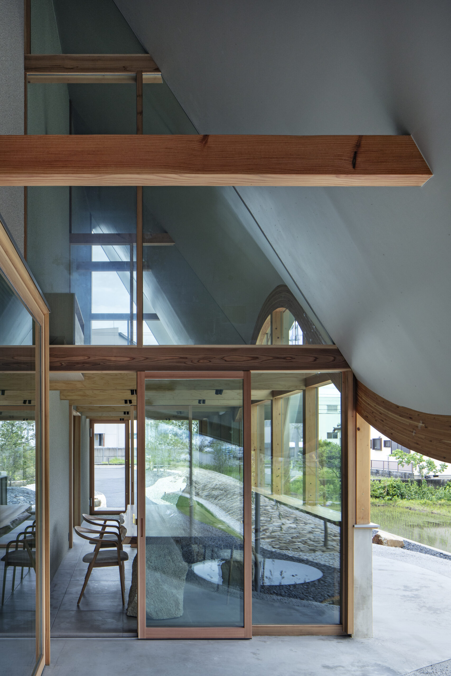 Inside, the spatial organization is conceived to connect with the exterior. Beneath the raised roof, a tall space houses the entrance and meeting rooms, naturally drawing the outside in. Courtyards and verandas are placed beneath the undulating roof to create intermediate spaces that mediate between inside and outside. Small margins and resting places are arranged throughout the building and site, where stones and greenery are incorporated into the interiors, producing a sense of continuity with nature even while indoors.This environment supports a variety of activities—meetings, breaks, or simply moments of noticing the changing seasons.