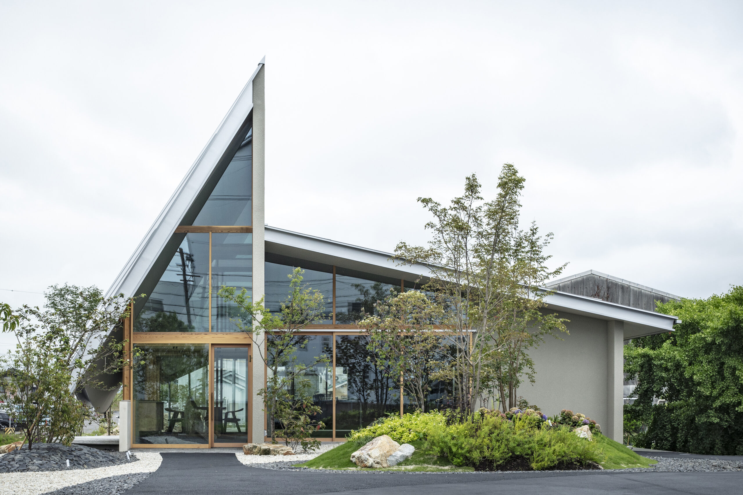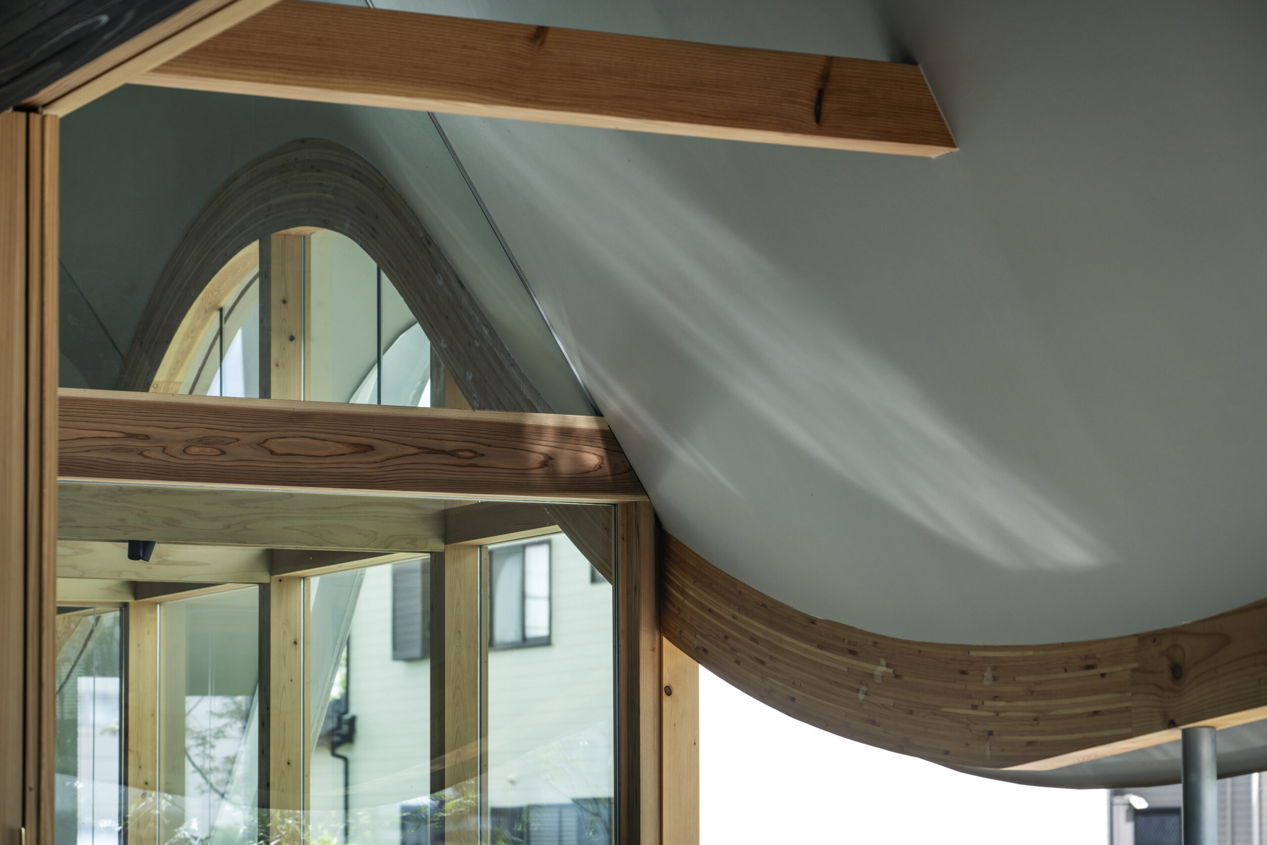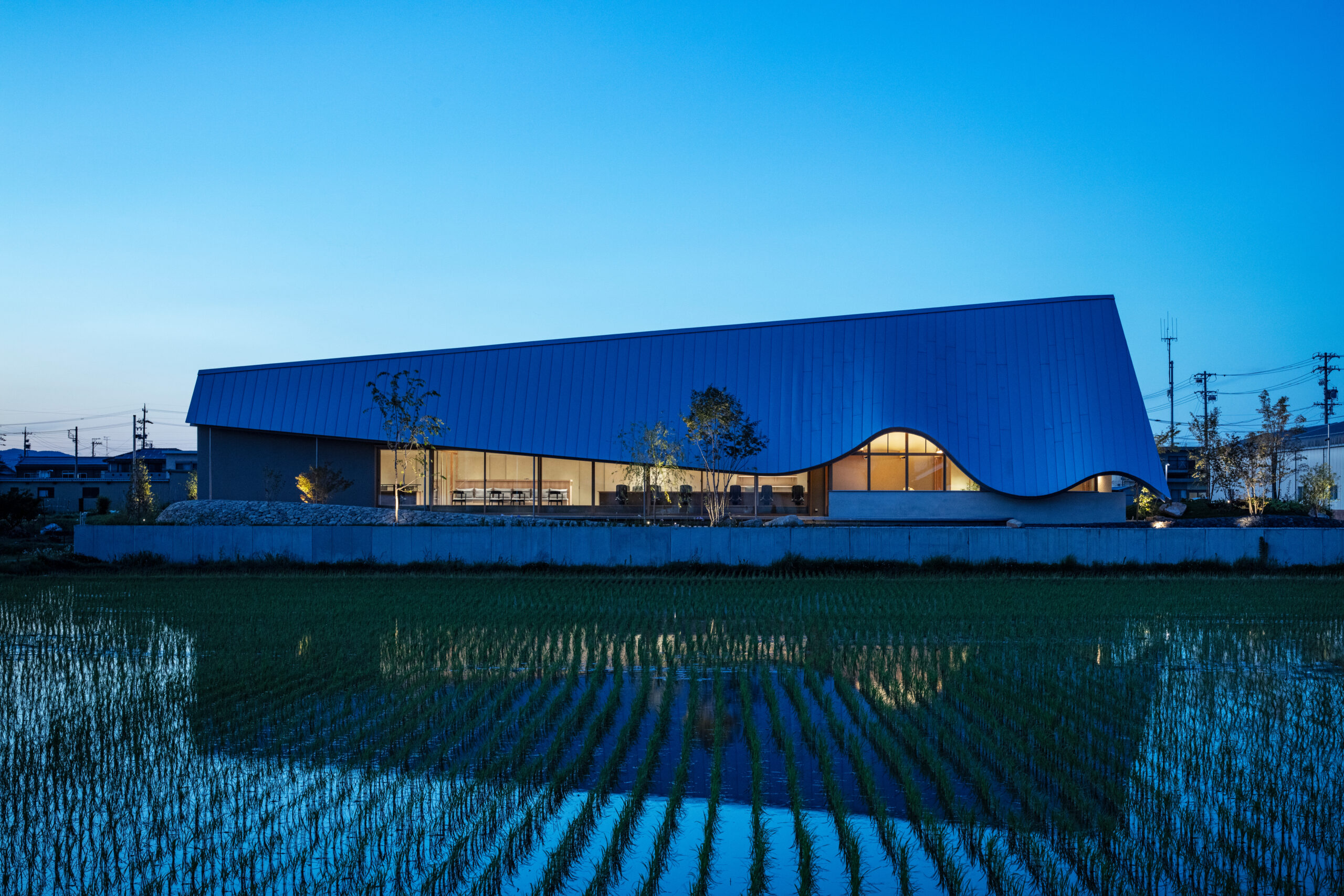 特徴的な屋根は東へ向かって大きくせり上がり、空を切り取るようなプロポーションを描く一方で、軒先は地面に迫るほど低く抑えている。屋根の一部にうねりを加えることで、建物の輪郭に微かな揺らぎを与え、光の反射や空の色、雨粒の動きなどが浮き立たせ、環境や現象を顕在化し、周辺環境の魅力を引き立てることを意図した。