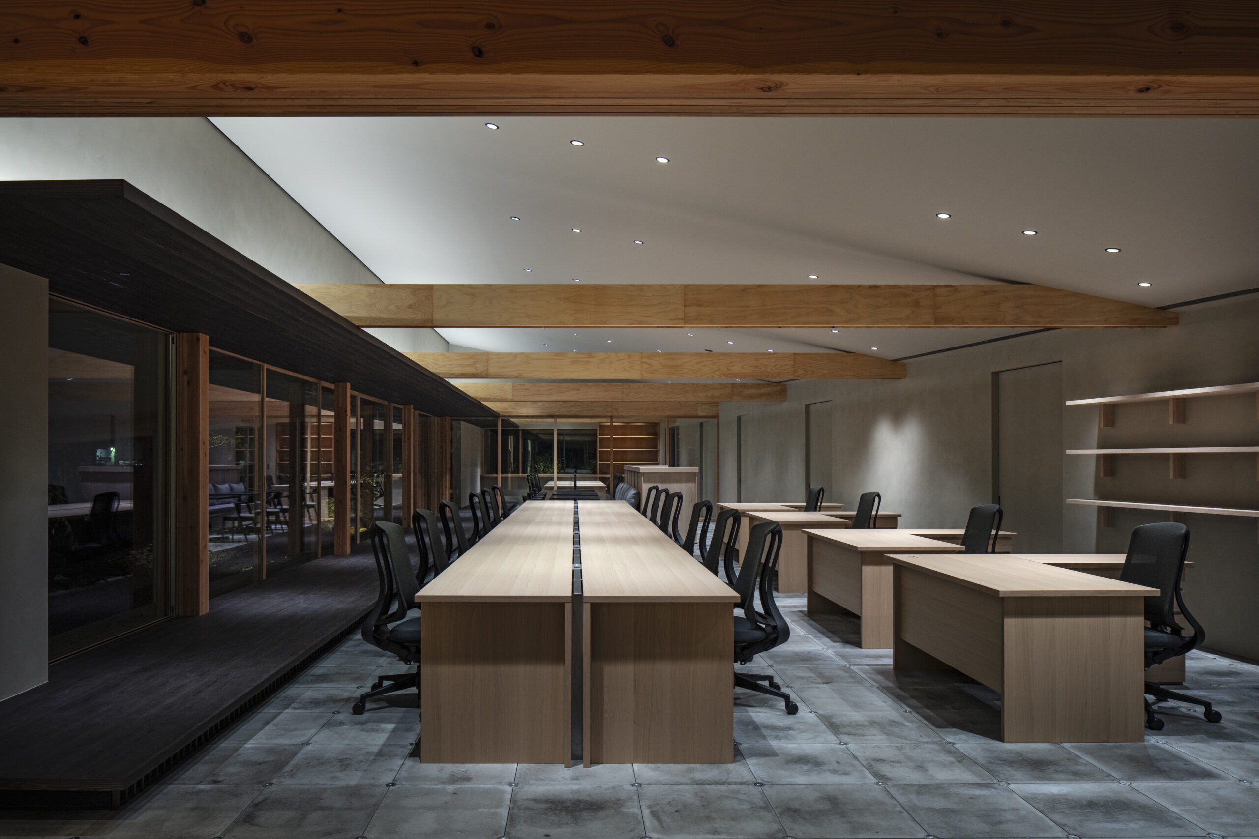 一方内部空間のつくりかたは、周囲の外部とつながることを意識して設計を行った。せり上がった軒下に自然と生まれる高さのある空間には、エントランスや会議室などの共用部を配置し、外とのつながりを内側にまで引き込んでいる。 揺らいだ屋根の下には、内庭や縁側といった中間領域を挿入し、内と外を緩やかにつなぐ構成とした。建物と敷地の各所に人の居場所となる余白を設け、石や植栽など外部の要素を積極的に室内に取り込むことで、屋内にいながら自然との連続性をつくりだしている。これにより、打ち合わせや休憩、ふと季節に目を向けるひとときなど、多様な活動が生まれる柔軟な場となっている。